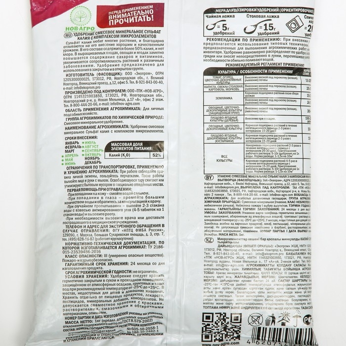 Сульфат калия — эффективное калийное удобрение для питания культур как открытого, так и закрытого грунта. Внесение производится через любые системы орошения. Сернокислый калий является универсальным удобрением не содержащим хлор и полностью растворимым в воде.