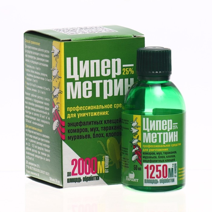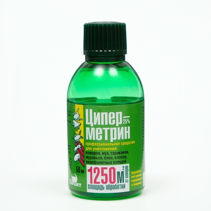 Циперметрин - эффективное средство для борьбы с насекомыми и клещами. Оно представляет собой концентрированный раствор действующего вещества циперметрина в количестве 25%.• имеет высокую эффективность• не оказывает вредного воздействия на человека и домашних животных при правильном использовании.Данный препарат позволяет уничтожить:• тараканов• муравьев• блох• комаров• мух• клещейДля использования средства необходимо развести его в соответствии с инструкцией на упаковке и нанести на поверхность, которую необходимо обработать. Циперметрин быстро впитывается в поверхность и начинает действовать уже через несколько минут после нанесения.Рекомендуется использовать данное средство для профилактики и лечения помещений, где проживают люди и животные, а также для обработки открытых территорий.Действующее вещество циперметрин 25%Срок остаточного действия: 4-6 недель.