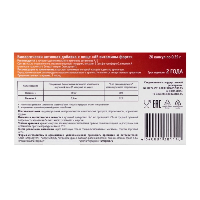 АЕ витамины-форте, 20 капсул по 350 мг.
