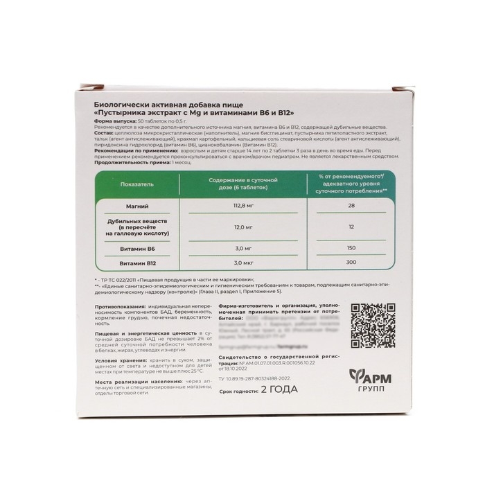 Состав: целлюлоза микрокристаллическая, магния цитрат, пустырника пятилопастного экстракт, пиридоксина гидрохлорид (витамин В6), тальк молотый.