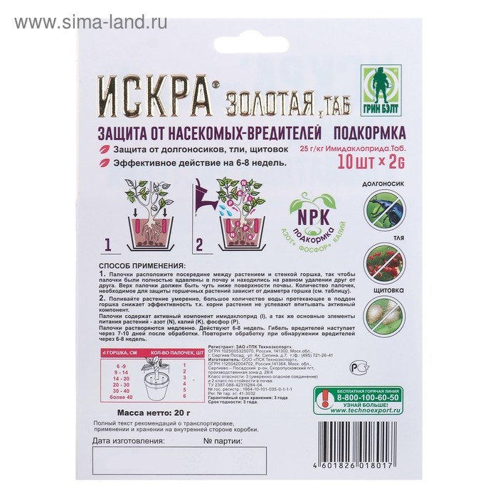 "Искра золотая" - новый препарат для защиты комнатных растений от тли, щитовок, долгоносиков и др. Обладает системным действием и защищает всё растение – от корня до кончиков листьев на протяжении 6-8 недель. Палочки-таблетки дополнительно содержат активный компонент имидаклоприд, а также комплексное удобрение, состоящее из азота, фосфора и калия.