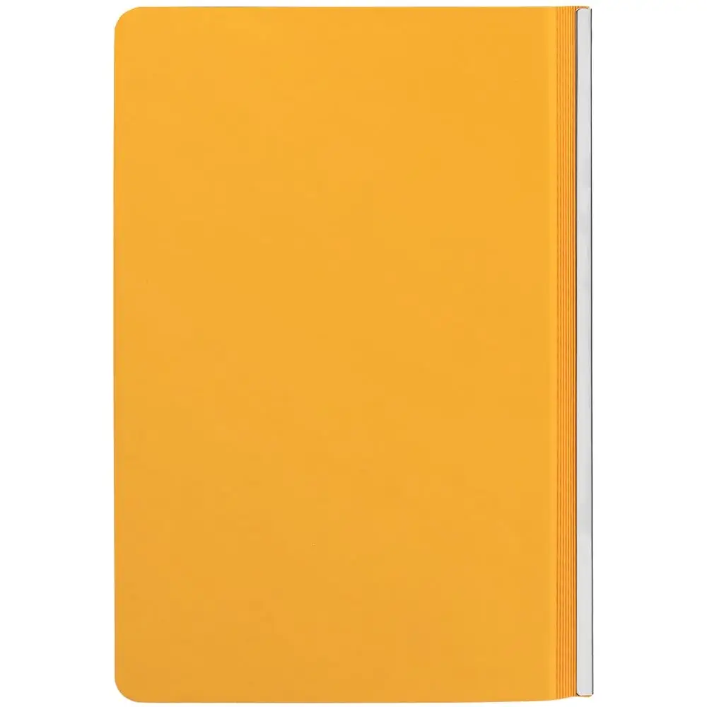 Ежедневник с гибкой обложкой и металлическим корешком, выполнен из материала Soft Touch, желтый КК, дополнен серебристым обрезом блока и ляссе.
