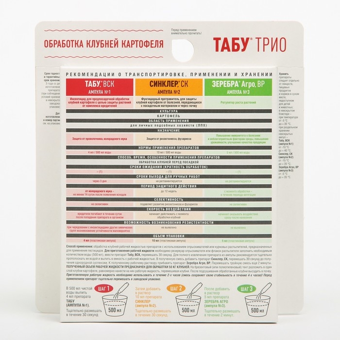 Табу ТРИО протравитель картофеля ( 3 ампулы) используется в виде баковой смеси из трех препаратов.