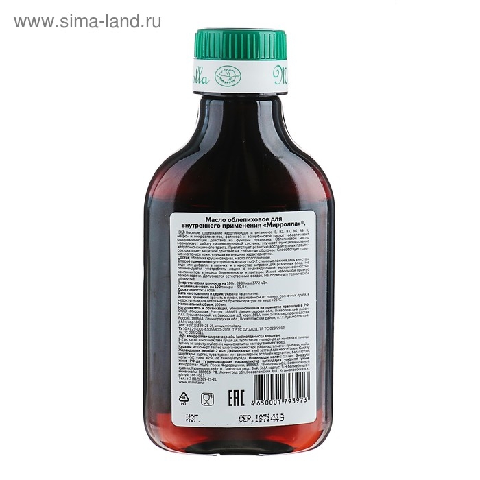 Масло облепиховое Mirrolla, пищевое, 100 мл