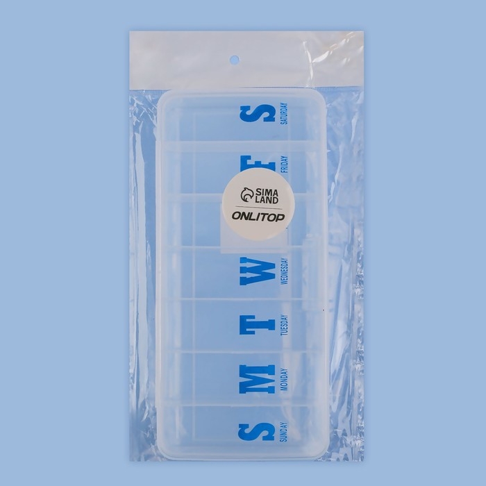 Таблетница «Неделька», немецкие буквы, 7 секций, 13,5 × 5 × 1,8 см, цвет синий/белый