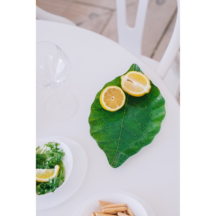 Оригинальное блюдо в виде листа придаст современный и свежий вид любому столу. Блюдо можно использовать для подачи фруктов, закусок и различных кондитерских изделий. Благодаря красочному дизайну эта посуда станет чудесным украшением праздничного стола и дополнит Ваш интерьер.