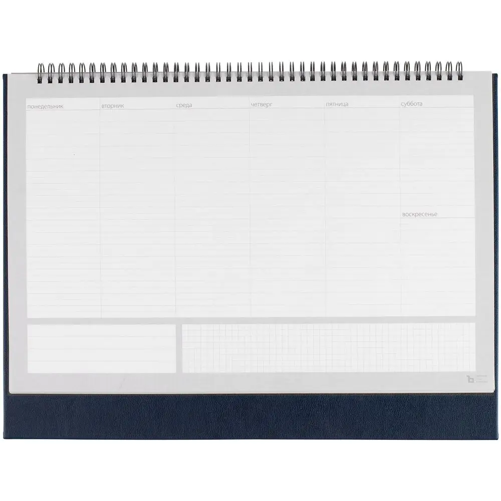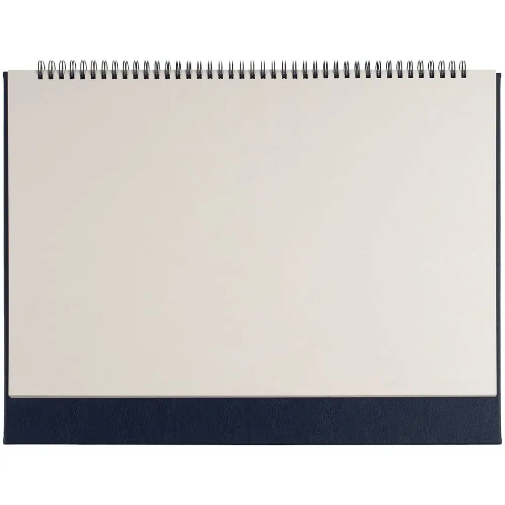 Настольный недатированный планер на открытой пружине. Обложка из белого мелованного картона, подложка из плотного картона в материале Petrus, тёмно-синий XX.