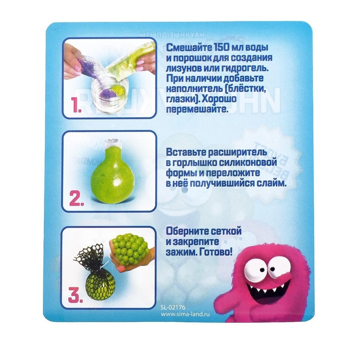 Набор для опытов «Мялка в сетке» позволит ребёнку провести увлекательный эксперимент по химии и создать необычную игрушку-антистресс своими руками.