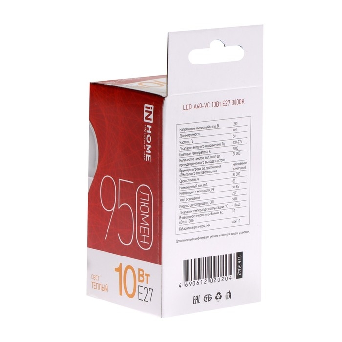Лампа светодиодная IN HOME LED-A60-VC, Е27, 10 Вт, 230 В, 3000 К, 900 Лм