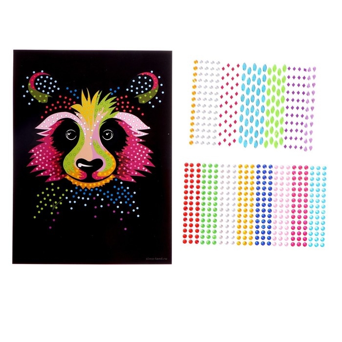 На основе расположена разноцветная картинка. Расположите на ней нужной формы и нужного размера стразы в соответствии с контуром-подсказкой. Творить могут даже самые маленькие: клей и ножницы не понадобятся.