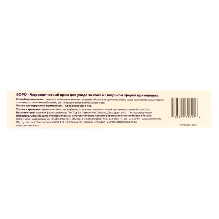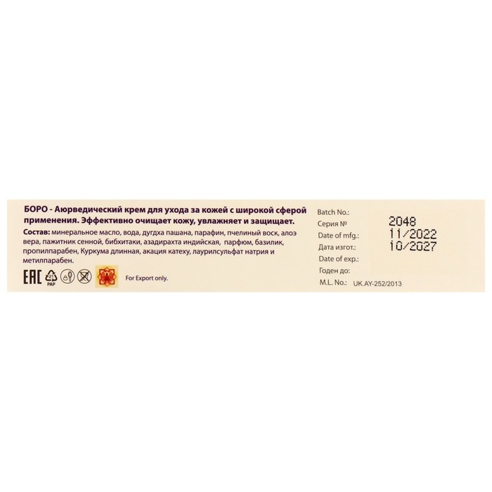 Крем аюрведический Боро для ухода за кожей, натуральный, 25 мл