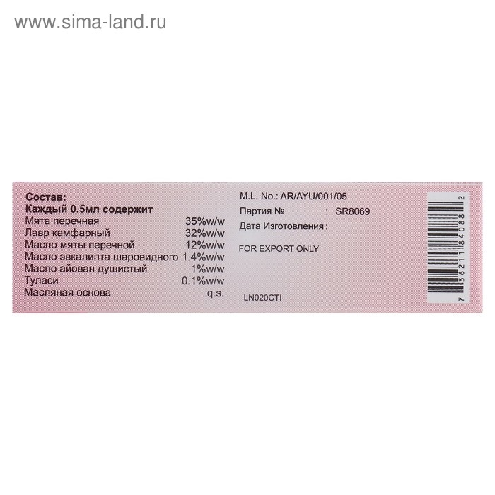 Состав: мята перечная, лавр камфарный, масло мяты перечной, масло эвкалипта шаровидного, масло айован душистый, масло туласи.