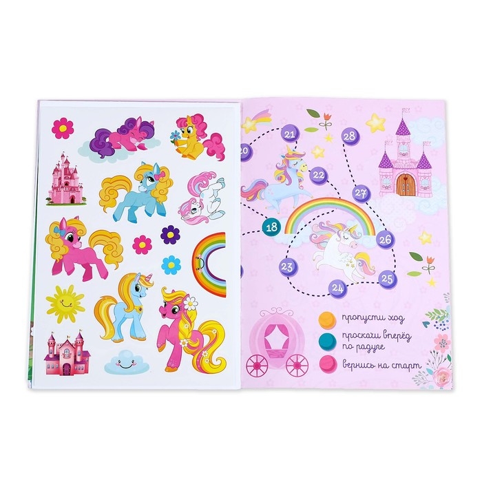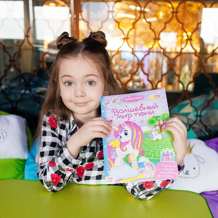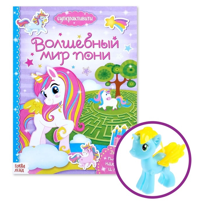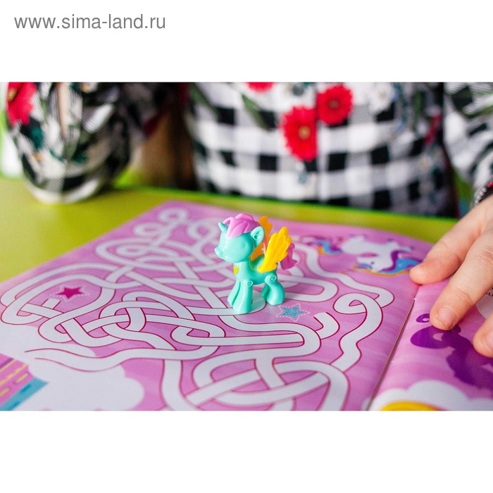 Внутри есть увлекательные задания, интересные факты, яркие наклейки. А ещё большой плакат и сюрприз — миниатюрная игрушка в виде сказочного пони.