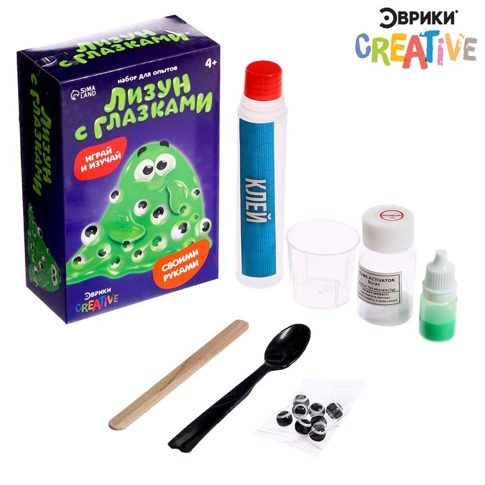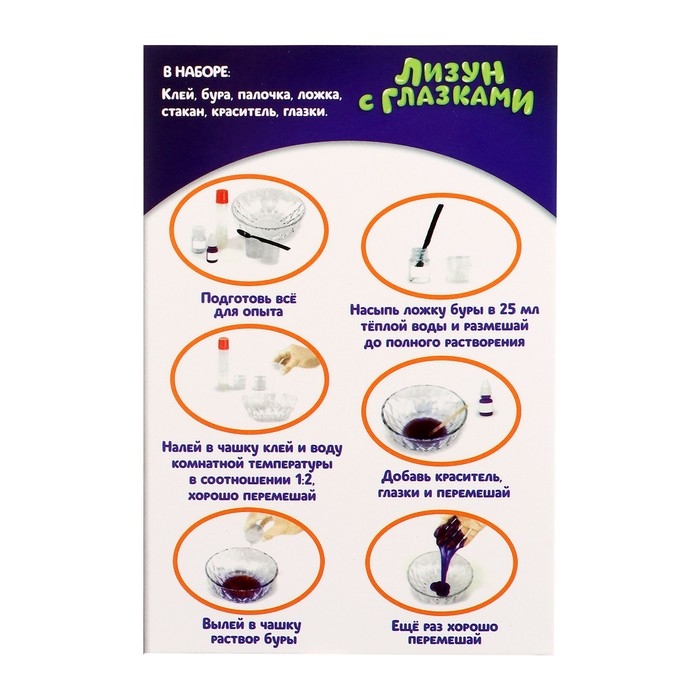 С набором «Эврики» ребёнок проведёт увлекательные эксперименты по химии и самостоятельно изготовит лизуна с помощью клея, буры и красителя.