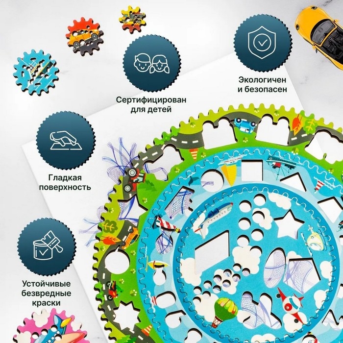 Спирограф — многофункциональная деревянная развивающая игрушка для рисования. Он имеет яркое оформление с тематическими изображениями, состоит из 2 зубчатых колёс с фигурными трафаретами и 5 кругов-шестерёнок.