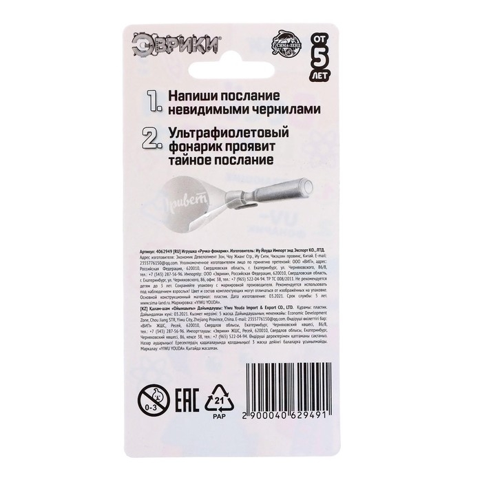 Ручка с невидимыми чернилами «Эврики», УФ-фонарик, цвета МИКС