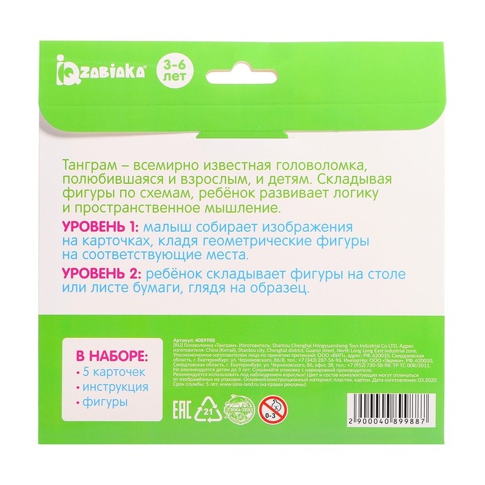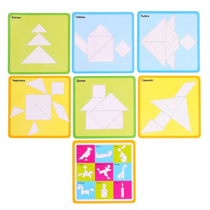 Головоломка «Танграм», 5 карточек с 10 схемами, по методике Монтессори, 3-6 лет
