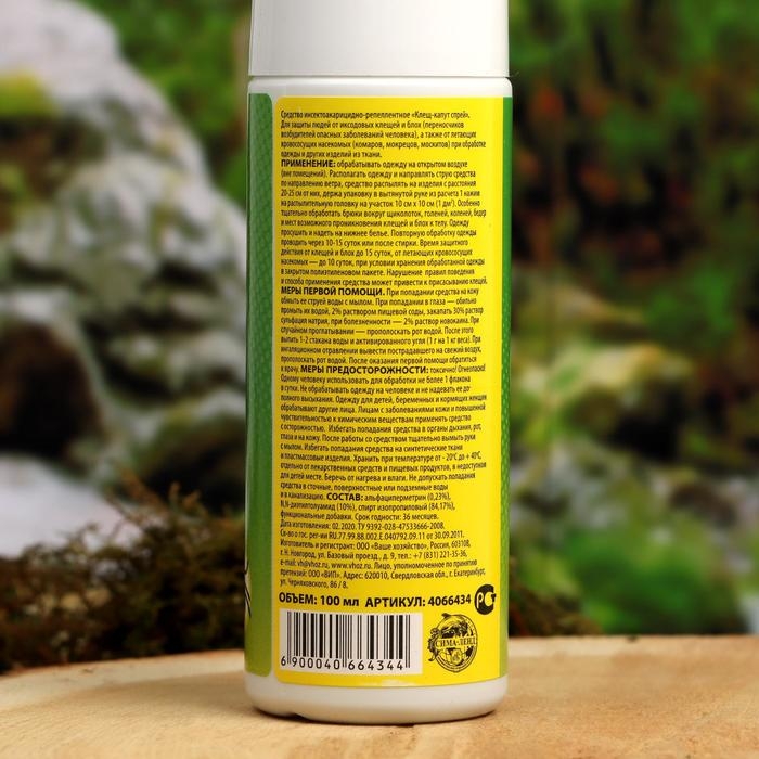 Средство инсектоакарицидно-репеллентное "Клещ-капут спрей". Для защиты людей от иксодовых клещей и блох (переносчиков возбудителей опасных заболеваний человека), а также от летающих кровососущих насекомых (комаров, мокрецов, москитов) при обработке одежды и других изделий из ткани.Применение: обрабатывать одежду на открытом воздухе (вне помещений). Располагать одежду и направлять струю средства по направлению ветра, средство распылять на изделия с расстояния 20-25 см от них, держа упаковку на расстоянии вытянутой руки из расчета 1 нажим на распылительную головку на участок 10 см х 10 см (1 кв.дм). Особенно тщательно обработать брюки вокруг щиколоток, голеней, коленей, бедер и мест возможного проникновения клещей и блох к телу. Одежду просушить и надеть на нижнее бельё. Повторную обработку одежды проводить через 10-15 суток или после стирки.Время защитного действия от клещей и блох до 15 суток, от летающих кровососущих насекомых до 10 суток, при условии хранения обработанной одежды в закрытом полиэтиленовом пакете.Нарушение правил поведения и способа применения средства может привести к присасыванию клещей.Меры первой помощи: при попадании в глаза - обильно промыть их водой, 2% раствором пищевой соды, закапать 30% раствор сульфацил натрия, при болезненности - 2% раствор новокаина. При случайном проглатывании - прополоскать рот водой. После этого выпить 1-2 стакана воды и и активированного угля (1 г на 1 кг веса). При ингаляционном отравлении вывести пострадавшего на свежий воздух, прополоскать рот водой. После оказания первой помощи обратиться к врачу.Меры предосторожности: токсично! Огнеопасно! Одному человеку использовать для обработки не более 1 флакона в сутки. Не обрабатывать одежду на человеке и не надевать ее до полного высыхания. Одежду для детей, беременных и кормящих женщин обрабатывают другие лица. Лицам с заболеваниями кожи и повышенной чувствительностью к химическим веществам применять средство с осторожностью. Избегать попадания средства в органы дыхания, рот, глаза и на кожу. После работы со средством тщательно вымыть руки с мылом. Избегать попадания средства на синтетические ткани и пластмассовые изделия.Хранить при температуре от -20°C до +40°C, отдельно от лекарственных средств и пищевых продуктов, в недоступном для детей месте. Беречь от нагрева и влаги. Не допускать попадания средства в сточные, поверхностные или подземные воды и в канализацию.Состав: альфациперметрин (0,23%), N,N-диэтилтолуамид (10%), спирт изопропиловый (84,17%), функциональные добавки.