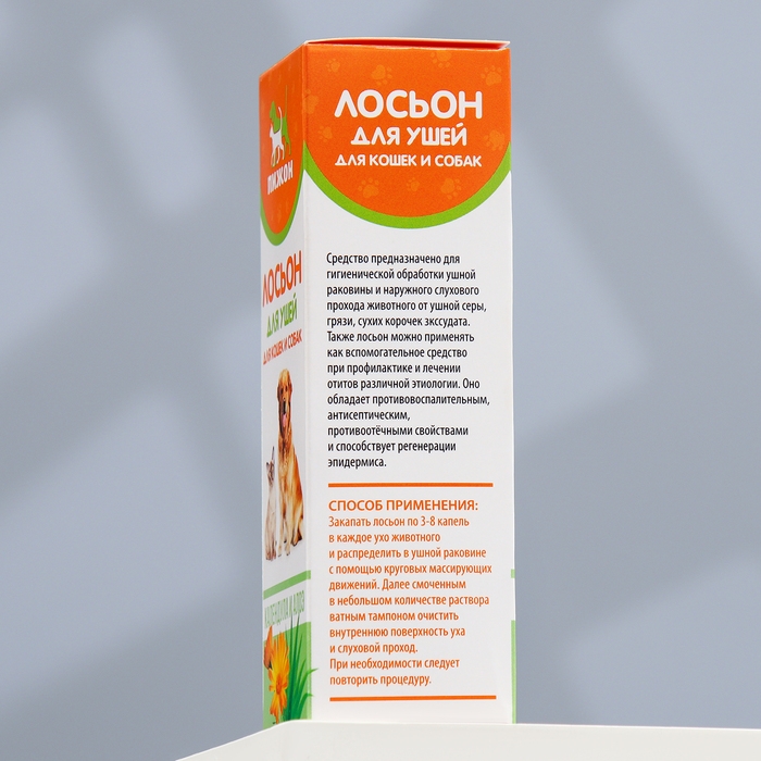 Средство предназначено для гигиенической обработки ушной раковины и наружного слухового прохода животного от ушной серы, грязи, сухих корочек экссудата.