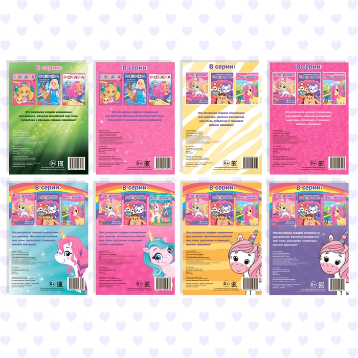 Набор раскрасок содержит восемь книг с различными тематиками: