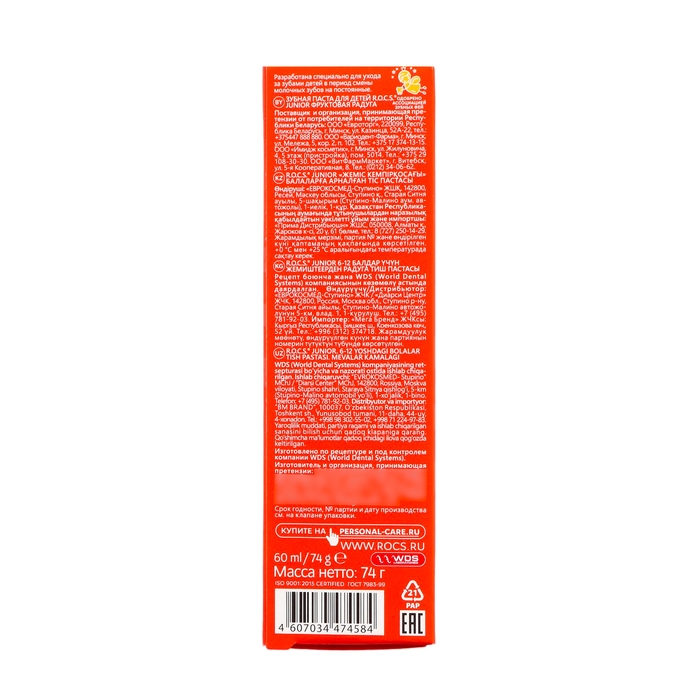 Зубная паста R.O.C.S. Junior, «Фруктовая радуга», 6-12 лет, 74 г