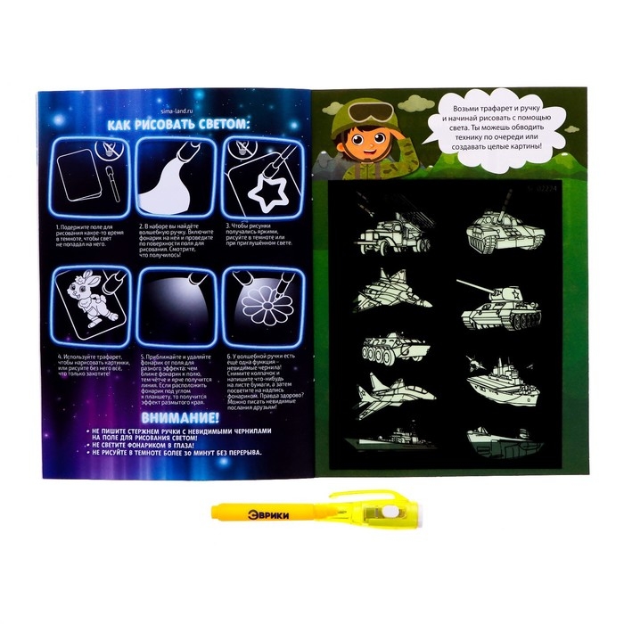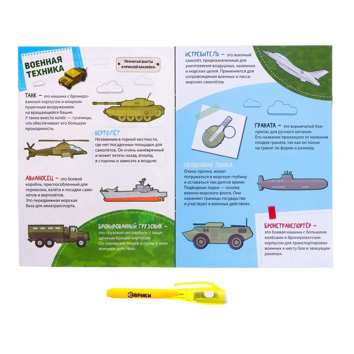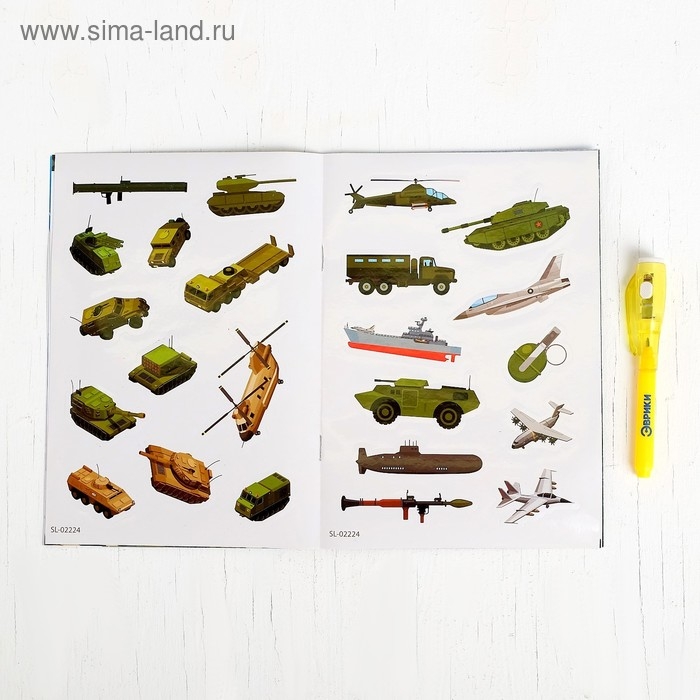 Активити-книжка с рисунками светом «Военная техника», ручка с фонариком и невидимыми чернилами