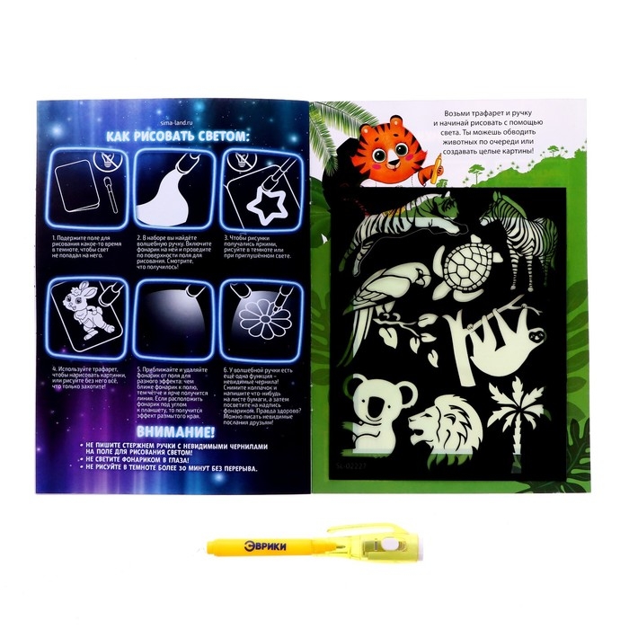 Набор для рисования светом «Милые зверята», ручка с фонариком и невидимыми чернилами
