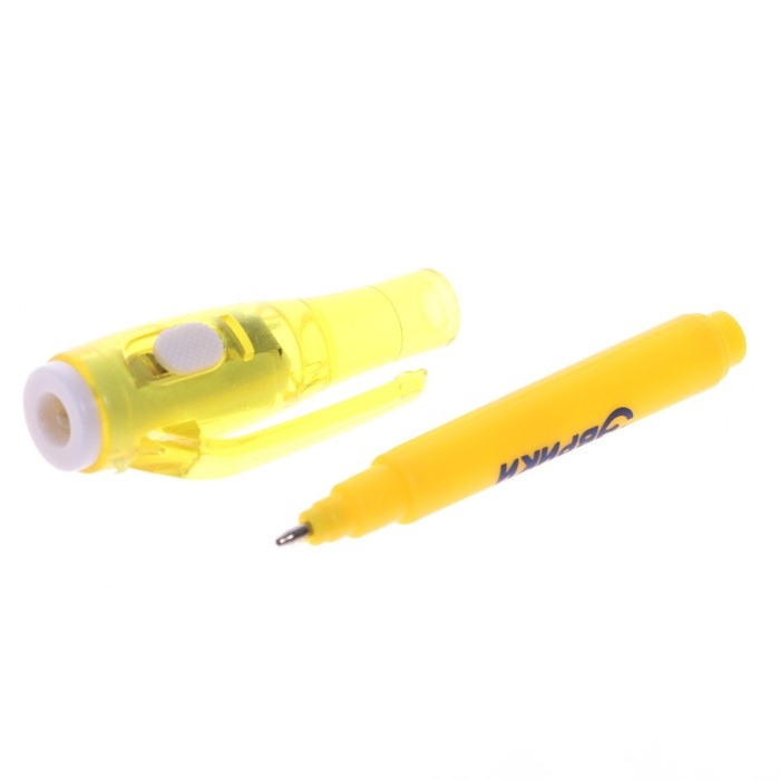 У волшебной ручки есть ещё одна функция — невидимые чернила. Снимите колпачок и напишите что-нибудь на листе бумаги, а затем посветите на надпись фонариком. Рисунок проявится.