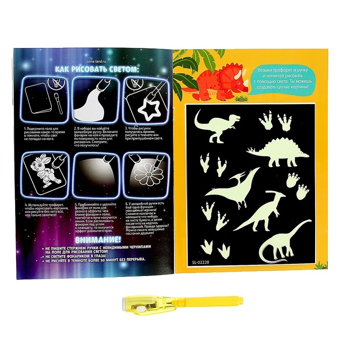 С помощью активити-книжки и специального маркера ребёнок научится рисовать светом. Малыш будет создавать картинки, используя трафареты, или придумает собственные сюжеты.