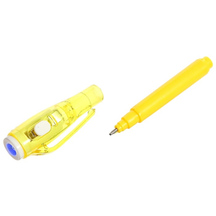 У волшебной ручки есть ещё одна функция — невидимые чернила. Снимите колпачок и напишите что-нибудь на листе бумаги, а затем посветите на надпись фонариком. Рисунок проявится.