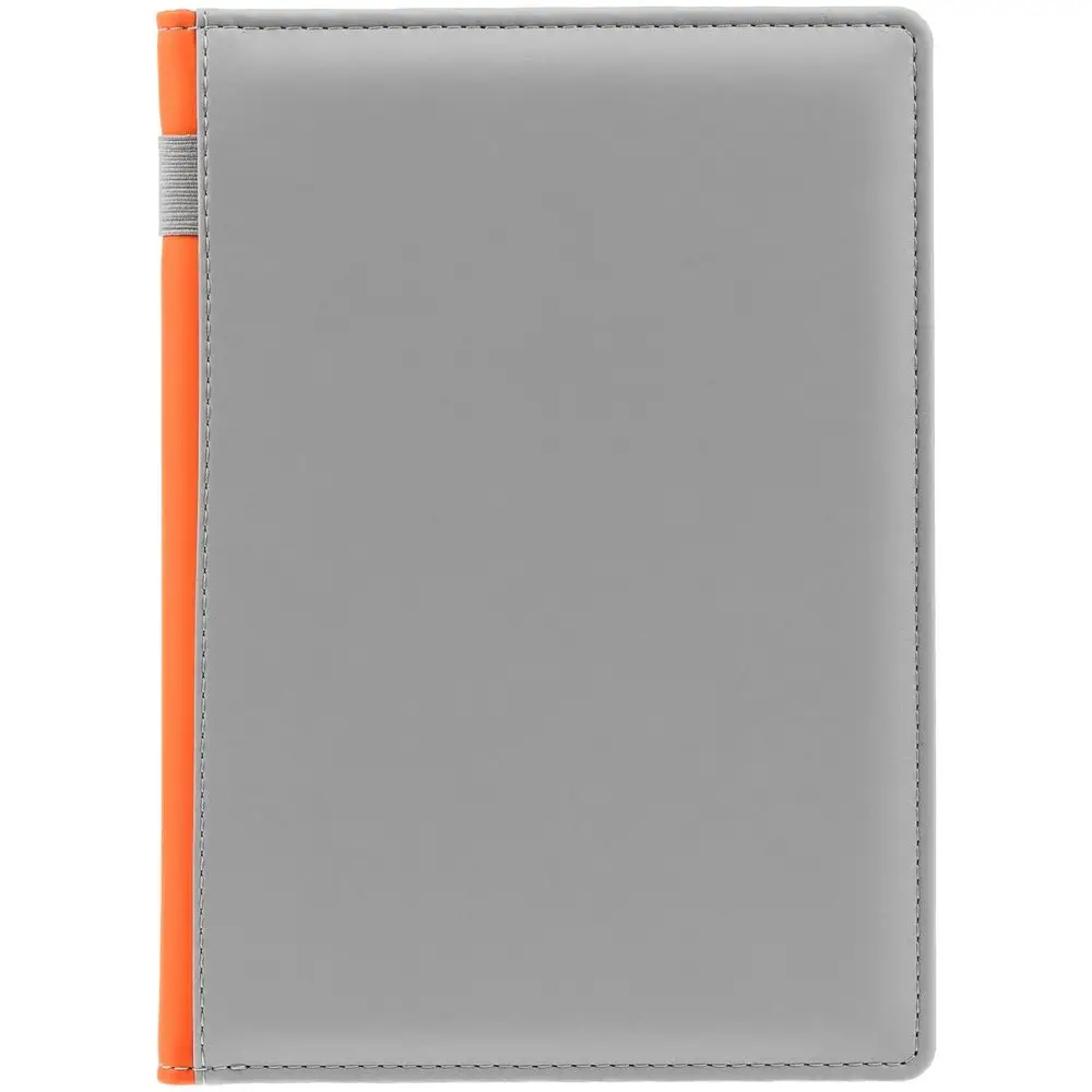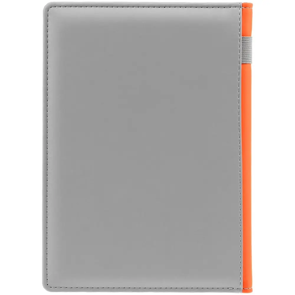 Твердая обложка с поролоном, материал обложки — Soft Touch, серый СС и Soft Touch, оранжевый ОО. На корешке ежедневника находится петля из резинки.