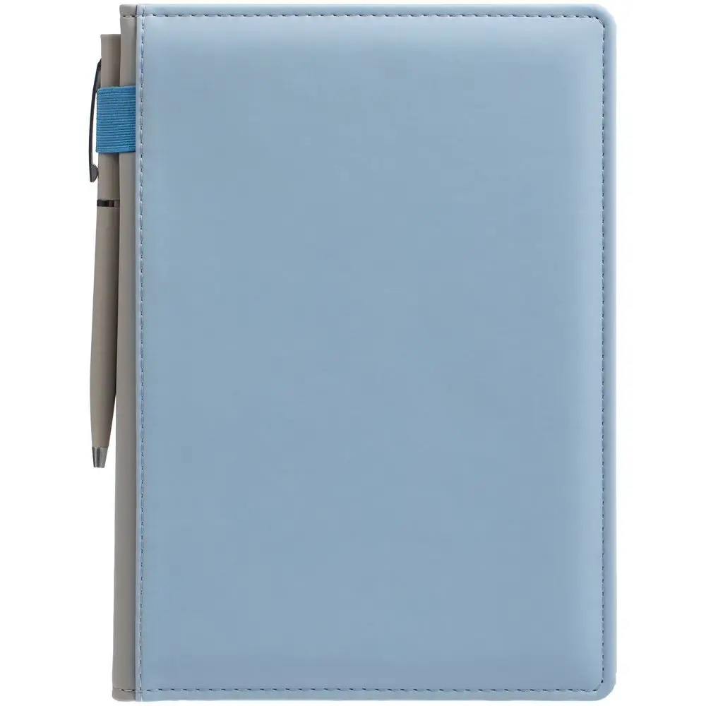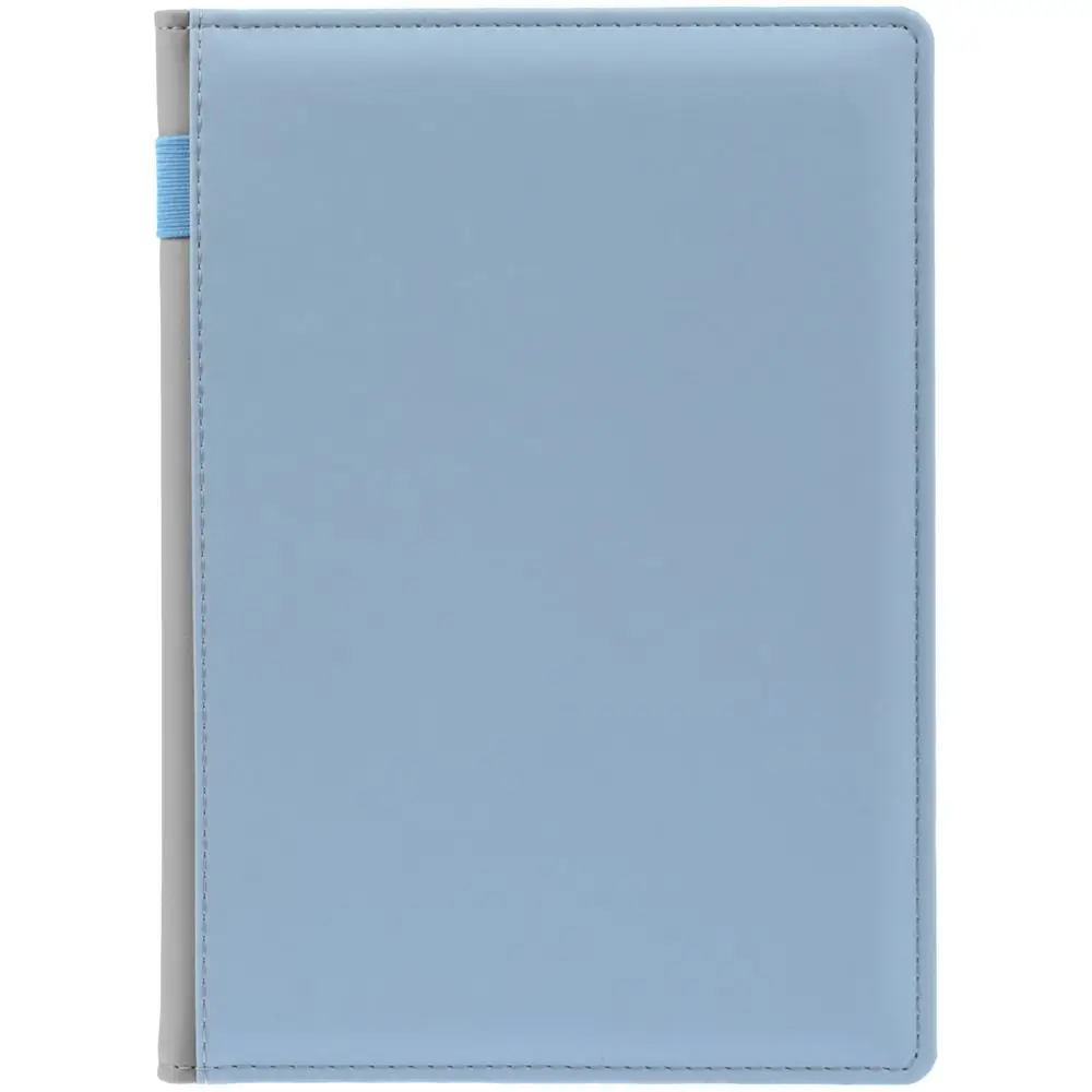 Твердая обложка с поролоном, материал обложки — Soft Touch, голубой JJ и Soft Touch, серый СС. На корешке ежедневника находится петля из резинки.