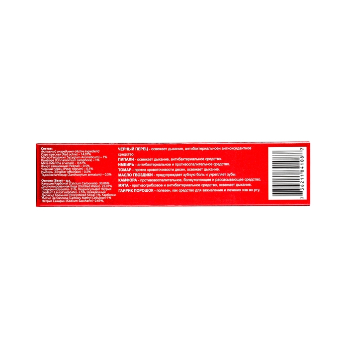 Основные компоненты пасты — перец чёрный, перец пиппали, имбирь, теджовати (томар), масло гвоздичного дерева, камфора, мята, порошок гаирика и подсластитель sodium saccharin.