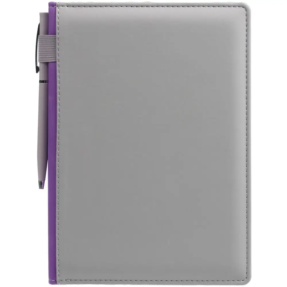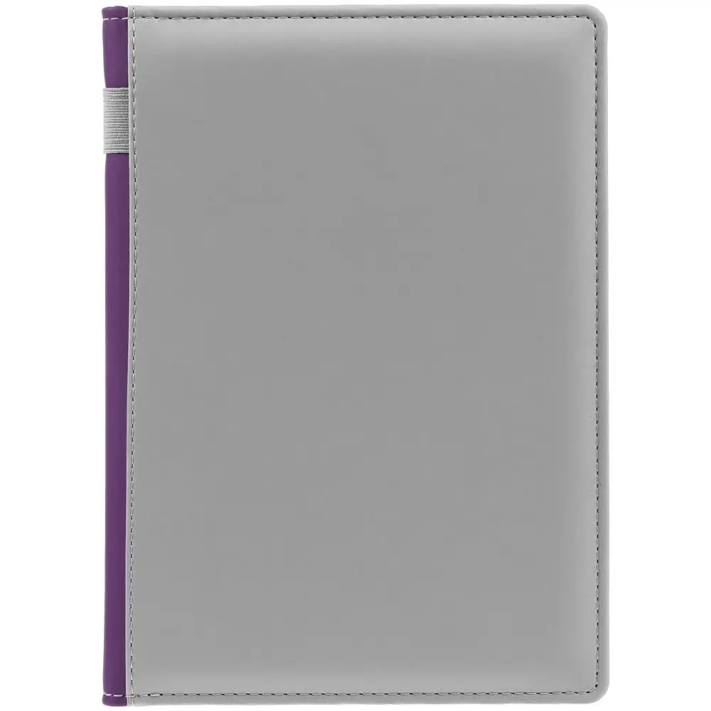 Твердая обложка с поролоном, материал обложки — Soft Touch, серый СС и Soft Touch, фиолетовый UU. На корешке ежедневника находится петля из резинки.
