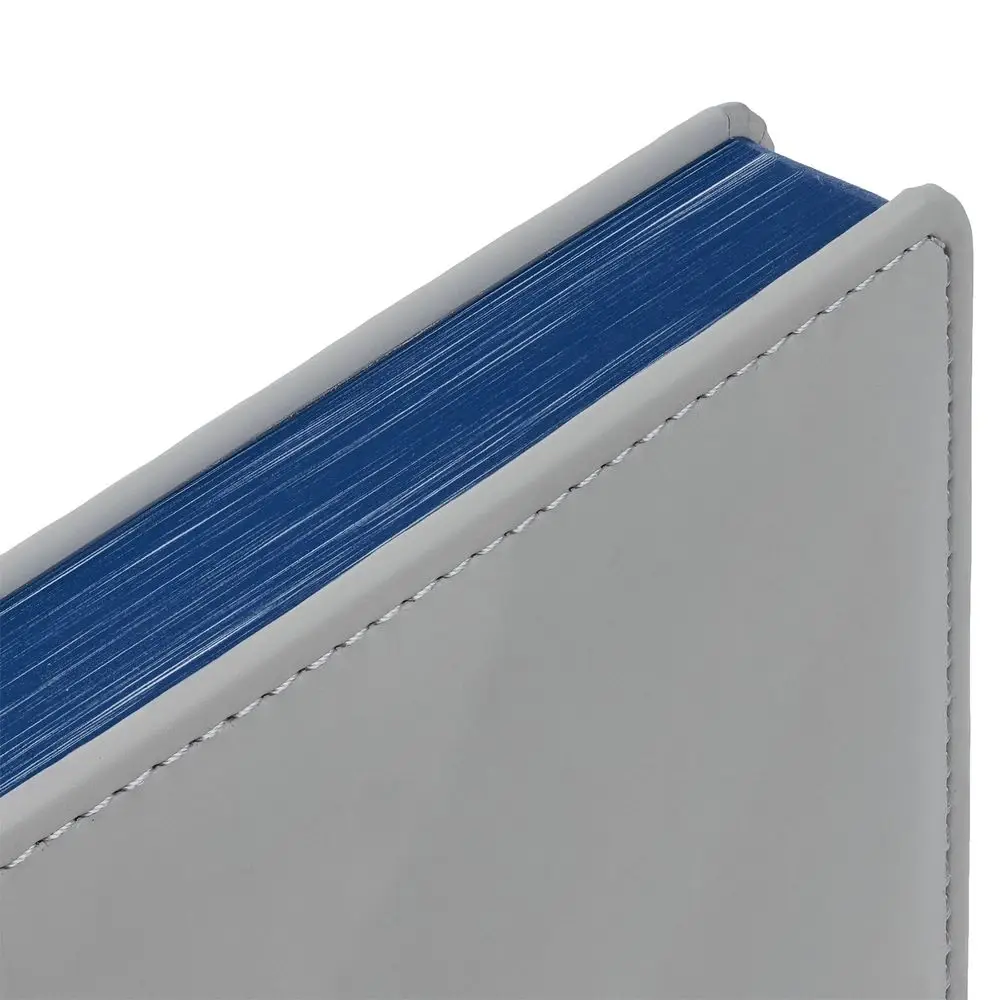 Твердая обложка с поролоном, материал обложки — Soft Touch, серый СС и Soft Touch Ultra, синий НН. На корешке ежедневника находится петля из резинки.