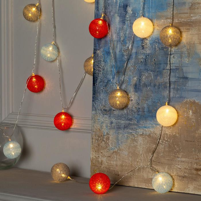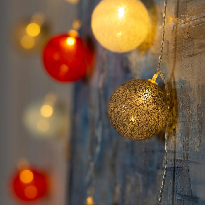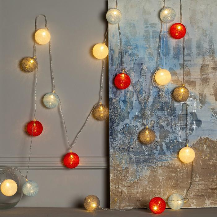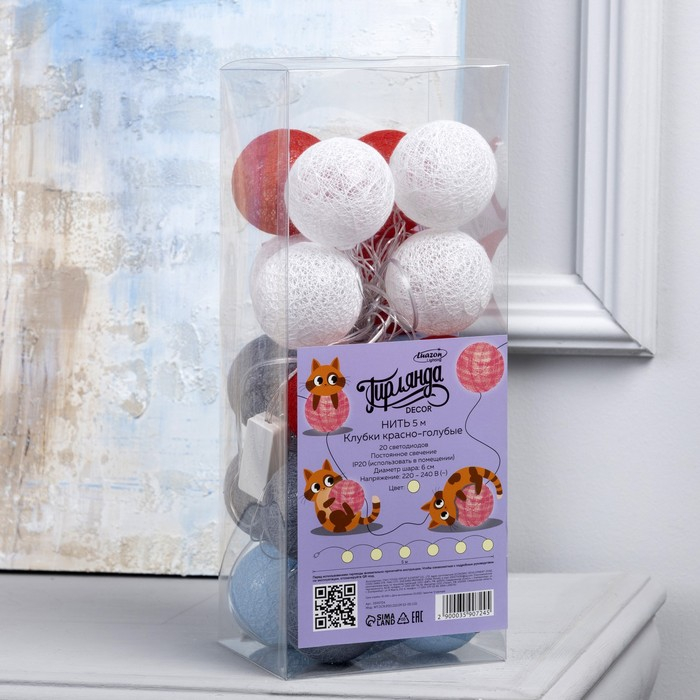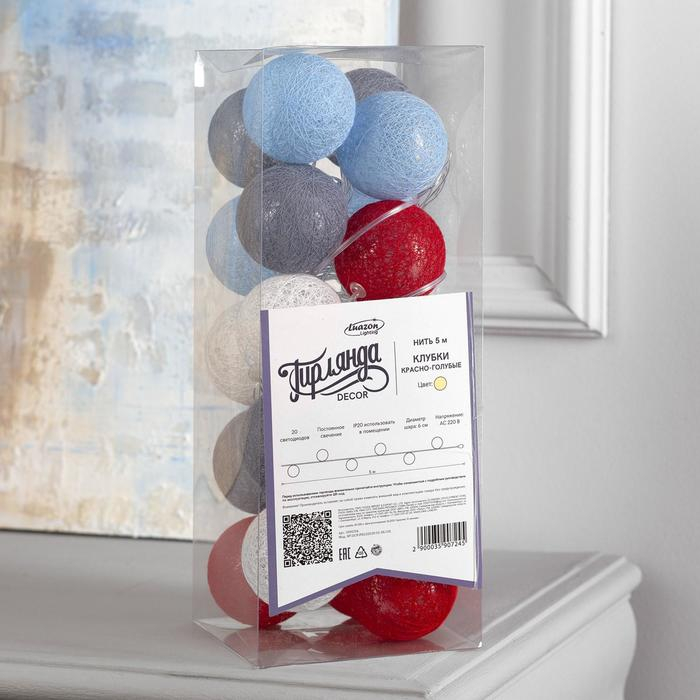 Гирлянда «Нить» 5 м с насадками «Клубки красно-голубые», IP20, прозрачная нить, 20 LED, свечение тёплое белое, 220 В