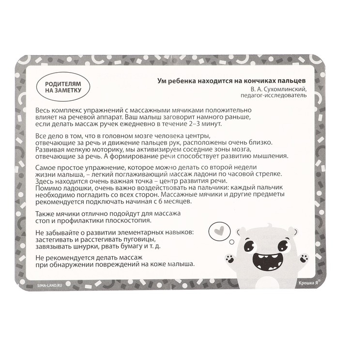 Мячик облдает рельефной поверхностью, способствующей развитию мелкой моторики и тактильных ощущений. Фактурная поверхность стимулирует и благотворно воздействует на нервные окончания, ответственные за большинство процессов в организме! Игрушкой можно не только играть в комнате, можно купаться, заниматься и делать массаж крохе. Яркие цвета мячиков помогают развить зрение.