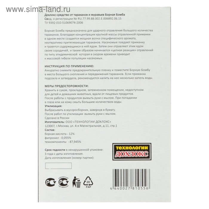 СОСТАВВ состав средства входнт: действующее вещевство фипронил (в пересчете на 100%) 0,05%, а также технологические добавки: консервант, гелеобразователь, кислота борная, кислота бензойная, пищевые аттраканты.ОПИСАНИЕБорная Мина предназначена для ударного уничтожения большого количества тараканов. Благодаря концентрации крупной массы отравленной приманки в одном месте создается мощная волна специфического аромата, неотвратимо притягивающая тараканов. Насекомые поедают приманку, и травятся содержащимся в ней ядом. Затем они отравляют этим ядом своих сородичей и таким образом начинается цепная реакция отравлений по типу эпидемической, которая в скором времени приводит к массовой гибели всей популяции насекомых.СПОСОБ ПРИМЕНЕНИЯАккуратно снимите предохранительную пленку и поместите Борную Мину в места большого скопления и передвижения тараканов. Если приманка подсохла и затвердела, рекомендуется налить на нее несколько капель воды.Борные Мины устанавливаются в санузлах: под раковину, под унитаз, под ванную; на куне: под холодильник, на холодильник, на навесные шкафы, на вытяжку, под шкафчики и рядом с мусорным ведром; в жилых комнатах: под шкафы, под кровати, на полки и т.д., в те места, где доступ насекомых особенно прост.