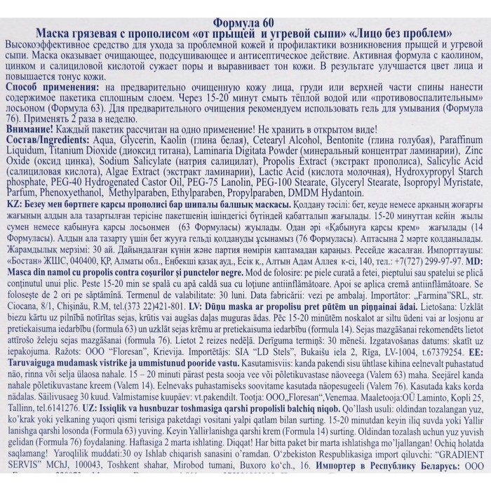 Состав: Вода питьевая, грязь Мертвого моря, глина белая, глицерин, воск эмульсионный, спирт цетеариловый, стеарат ПЭГ-8, масло соевое, масло парфюмерное, парафин, ПЭГ-40 гидрогенизированное касторовое масло, крахмал модифицированный, цинка оксид, сера, экстракт прополиса, экстракт календулы, экстракт ламинарии, микрокар ПМ3, метилхлороизотиазолинон, метилизотиазолинон, кислота гиалуроновая, краситель голубой (CI 42090), парфюмерная композиция.