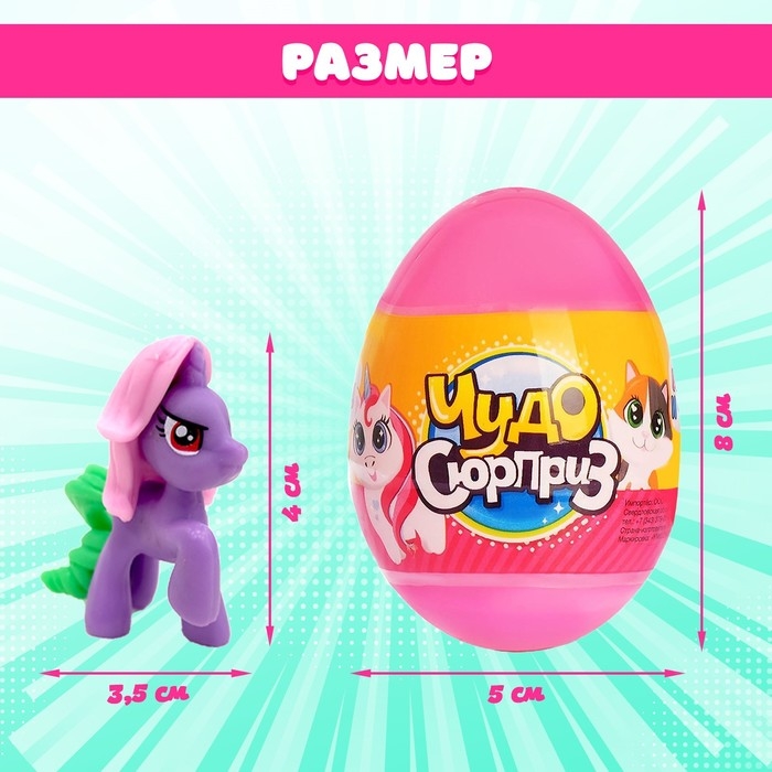 Чудо-сюрприз «Пони» — это увлекательное приключение для маленьких исследователей. Яркое яйцо скрывает в себе миниатюрную фигурку пони и набор ярких наклеек.