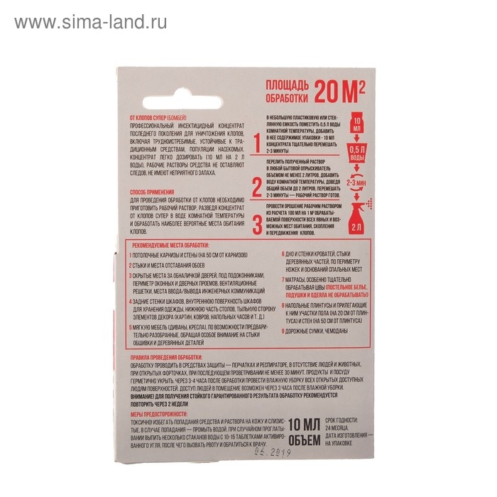 Назначение: для уничтожения клопов.Профессиональный концентрат уничтожает все виды клопов, включая трудноискоренимые популяции, устойчивые к традиционным средствам. Раствор данного продукта не оставляет следов, практически не имеет запаха и безопасен для теплокровных. Насекомые гибнут через 1 сутки.Действующее вещество: ацетамиприд (20 %).Способ применения: для проведения обработки от клопов необходимо подготовить рабочий раствор, раздедя концентрат от клопов в воде комнатной температуры и обработать наиболее вероятные места обитания клопов.