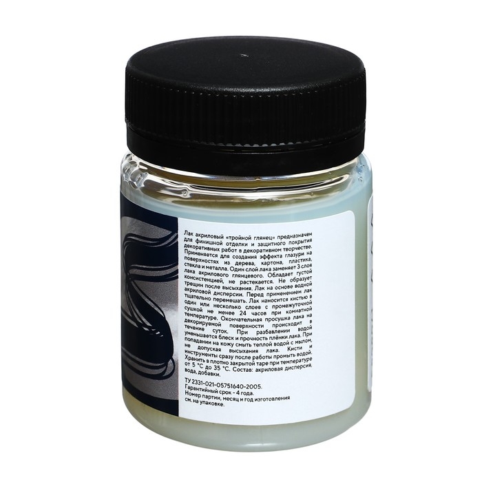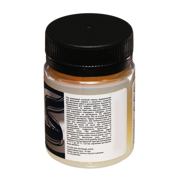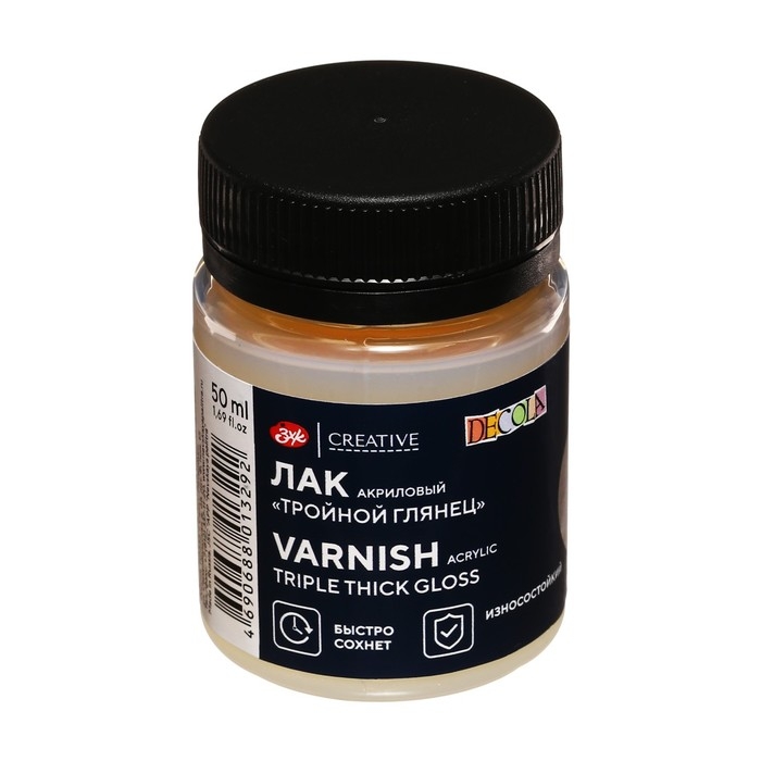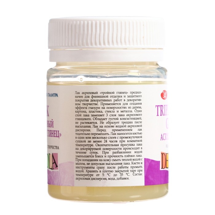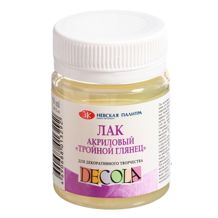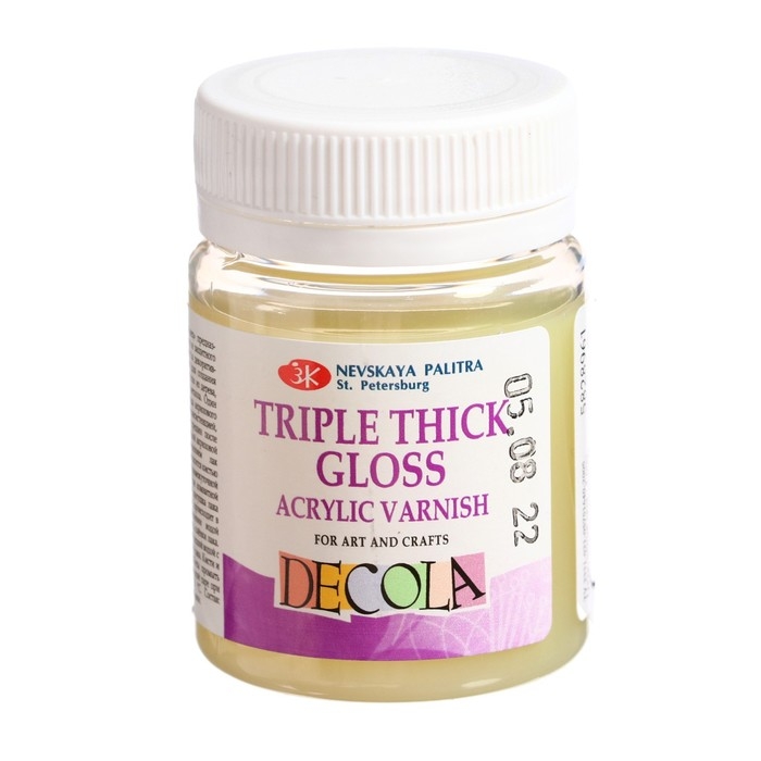 Акриловый лак "Тройной глянец" на водной основе используется для завершения работ, выполненными акриловыми красками. Часто применяется при росписи на различных поверхностях.
