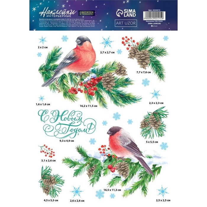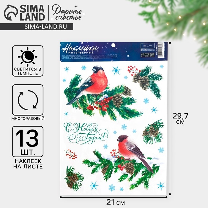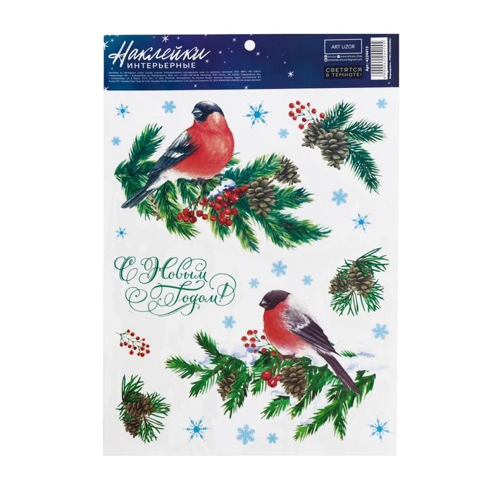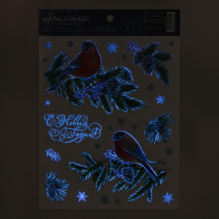 Наклейки новогодние, интерьерные со светящимся слоем «Снегири», 21 х 29.7 см, Новый год