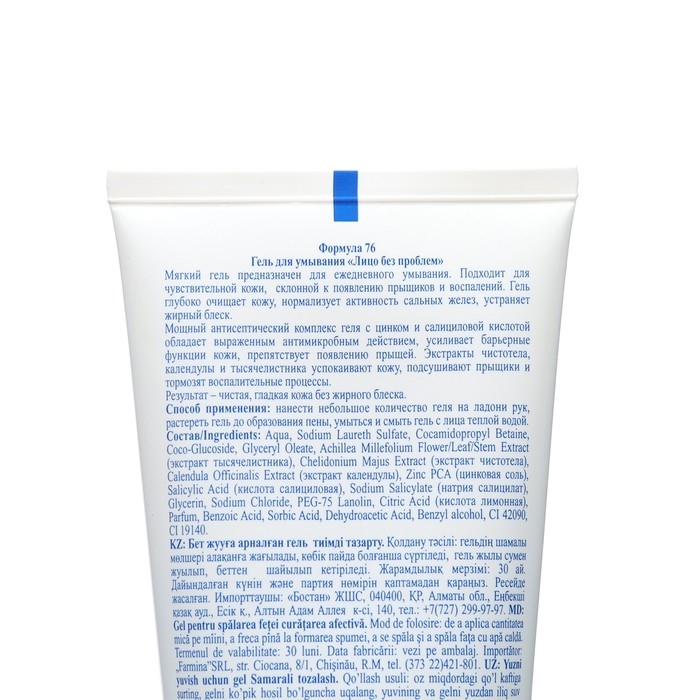 Состав: Aqua, Sodium Laureth Sulfate, Cocamidopropyl Betaine, Coco-Glucoside, Glyceryl Oleate, Achillea Millefolium Flower/Leaf/Stem Extract (экстракт тысячелистника), Chelidonium Majus Extract (экстракт чистотела), Calendula Officinalis Extract (экстракт календулы), Zinc PCA (цинковая соль), Salicylic Acid (кислота салициловая), Sodium Salicylate (натрия салицилат), Glycerin, Sodium Chloride, PEG-75 Lanolin, Citric Acid (кислота лимонная), Parfum, Benzoic Acid, Sorbic Acid, Dehydroacetic Acid, Benzyl alcohol, CI 42090, CI 19140.