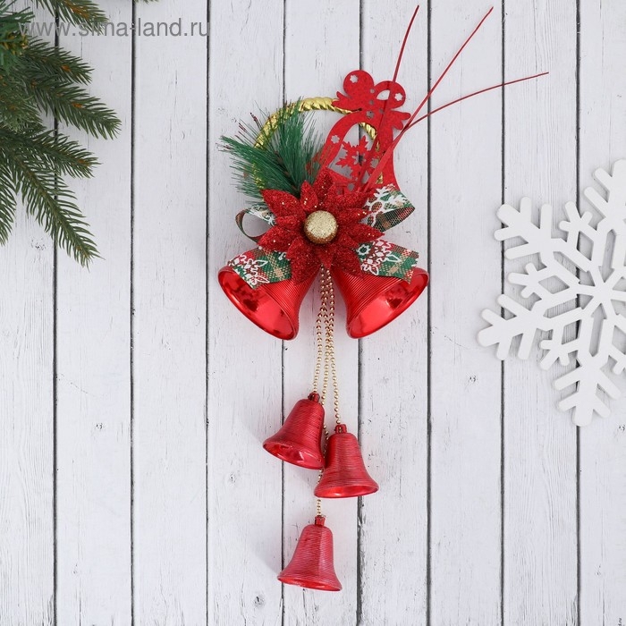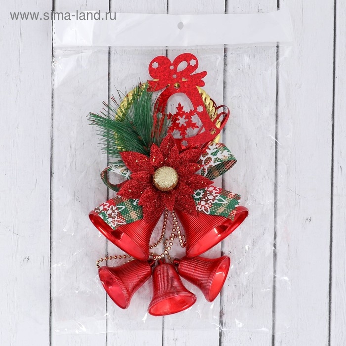 Украшение новогоднее "Колокольчики на подвесе с цветком и веточкой" 12х30 см, красный