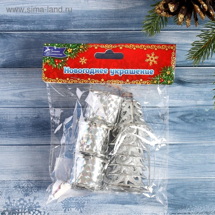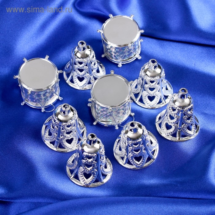 Набор украшений пластик 9 шт "Кружева" (6 колокольчиков, 3 барабана) серебро