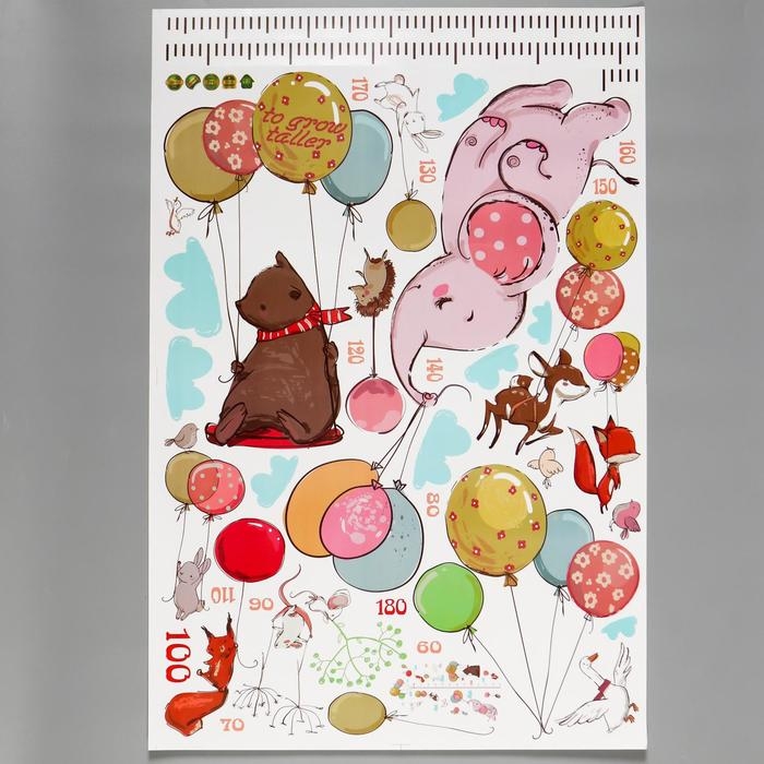 Наклейка пластик интерьерная ростомер "Зверята с воздушными шариками" 60х90 см