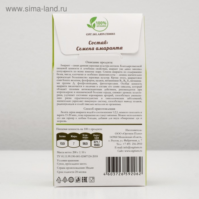 Амарант - самая древняя зерновая культура ацтеков. Благодаря высокой пищевой ценности и лечебным свойствам, амарант уже давно распространил свою популярность по всему земному шару. Семена амаранта по содержанию белка, масла, клетчатки и особенно аминокислоты – лизина, значительно превосходят большинство зерновых культур. Кроме этого, амарантовое семя богато железом, фосфором, калием, витаминами В1, В2, Е, витаминами группы Д, фосфолипидами, фитостеролами. Особая ценность амаранта заключается в наличие в составе его семян сквалена, который обладает сильным антиоксидантным действием, рекомендуется при атеросклерозе и ишемической болезни сердца, снижает уровень холестерина, улучшает состояние коронарных артерий, способствует уменьшению риска сердечно-сосудистых и онкологических заболеваний, значительно укрепляет иммунную систему, способствует выводу шлаков, радионуклидов и солей тяжелых металлов из организма.