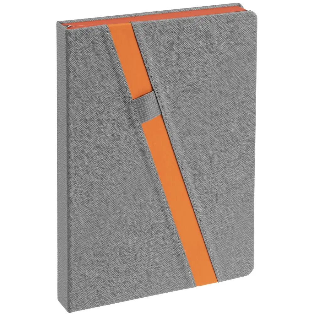 Ежедневник с твердой обложкой и тонированным обрезом. Выполнен из материала Nice Touch, серый СС, и Soft Touch, оранжевый ОО, дополнен серым ляссе.