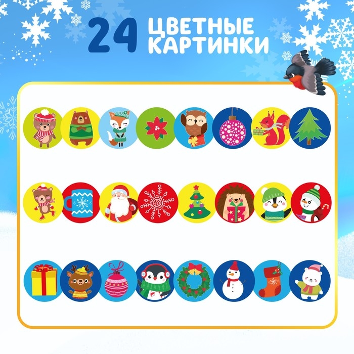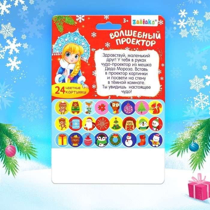 В набор входят: проектор-фонарик, 3 слайда (24 цветные картинки) и 12 светящихся в темноте снежинок.